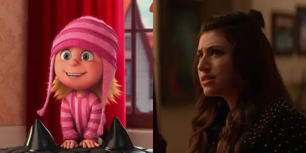 Obrázek Edith se usmívá v Despicable Me a Dana Gaier vypadající zmatená
