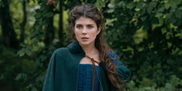 Emly Bader na sobě zelené šaty a cop v mé dámě Jane