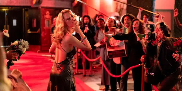 Maxine (Mia Goth) na červeném koberci obklopeném tiskem fouká polibky na publikum v Maxxxine (2024)