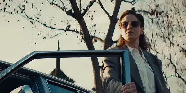 Silueta tajemného muže, který nosí klobouk, který sleduje ženu oknem v Maxxxine (2024)