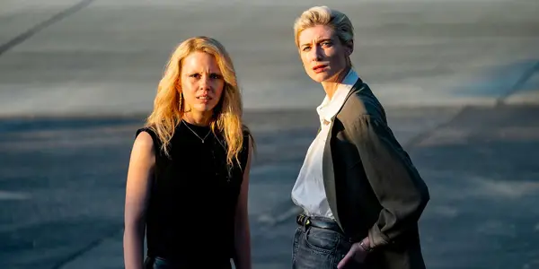 Maxine (Mia Goth) a Elizabeth (Elizabeth Debicki) se dívají na něco s zmateným výrazy v Maxxxine (2024)